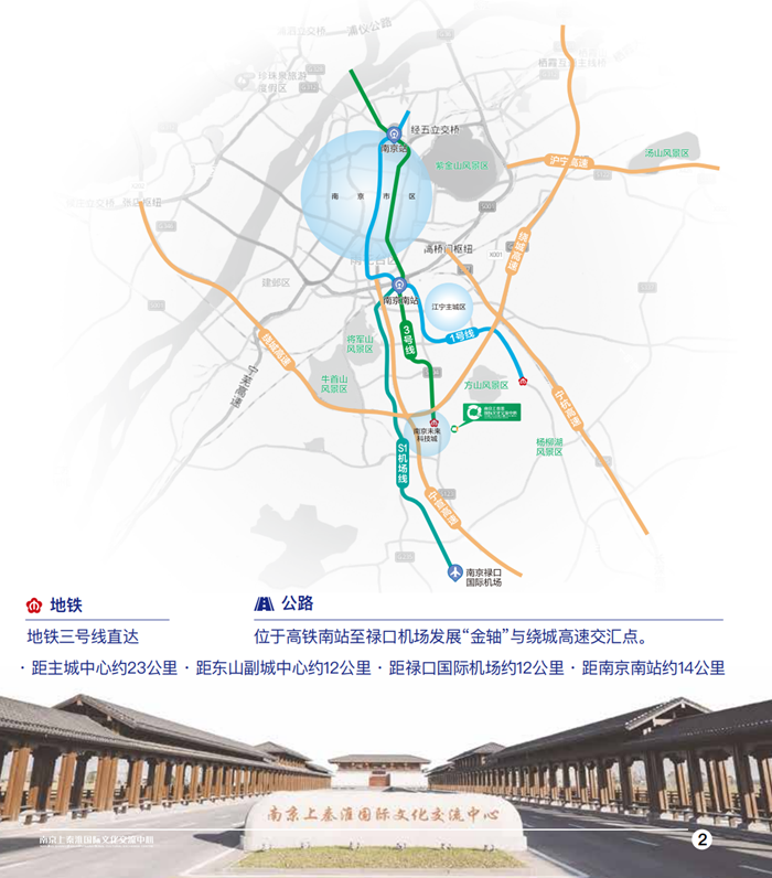 南京上秦淮國際文化交流中心,位于上秦淮國家生態(tài)濕地西片區(qū),南京市江寧區(qū)中部,地處南京南站到祿口機(jī)場這一黃金發(fā)展軸上。距新街口CBD約30分鐘車程,距祿口國際機(jī)場和南京南站約15分鐘車程。周邊集聚了萬豪、皇冠、假日等十多家高星級酒店,萬達(dá)、金鷹、砂之船等一批城市綜合體,以及上秦淮濕地公園、華誼電影小鎮(zhèn)、牛首山、湯山溫泉等一批文化旅游功能區(qū)。